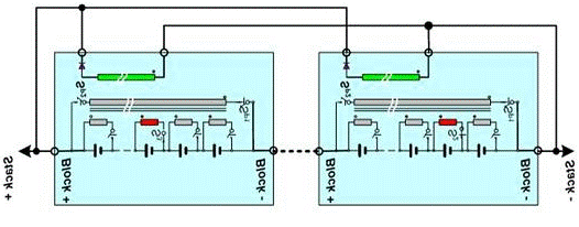 鋰電池儲能能力強,但單個電池的電壓和電流都太低,不足以滿足混合動力電機的需要。為增加電流需將多個電池并聯(lián)起來,為獲得更高的電壓,則要把多個電池串聯(lián)起來。單個鋰電池的電壓一般介于3.3~3.6V之間。例如,將多達12 個電池串聯(lián)組成一個電池塊(block)輸出電壓介于30~45V 之間,而混合動力汽車驅(qū)動需要336V左右的直流電源電壓,因此通常需要8-10個電池塊(block)串聯(lián)起來使用,意味著電動汽車的電池組是數(shù)量眾多的的單體電池組成(100節(jié)以上)。