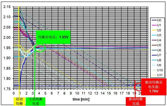 采用被動均衡時,用于電容容量和電容電壓成正比,采用固定電阻進行被動均衡時,電壓曲線接近斜率固定的直線,圖中虛線為模擬被動均衡時的電壓曲線。經(jīng)18分鐘的被動均衡后,超級電容電壓趨于一致達到1.76V。