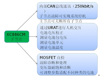 控制上述MOSFET工作的是汽車級8位單片機XC886CM,該單片機具有8通道10位AD,可以方便的采集各個電池單元的電壓數(shù)據(jù)和溫度數(shù)據(jù)。QFP-48的封裝使它有足夠的IO完成多達13個MOSFET的控制工作。CAN、SPI、UART等豐富的通信接口使子節(jié)點具有CAN總線通信功能之外,能夠?qū)崿F(xiàn)和PC的通信,以方便試驗階段的控制和演示。硬件乘除單元MDU可進行16位數(shù)據(jù)的乘除,實現(xiàn)快速運算。