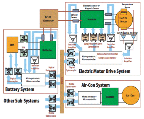 石油價(jià)格的迅速上漲推動(dòng)了高能效混合動(dòng)力汽車(chē)(HEV)的增長(zhǎng)成為汽車(chē)行業(yè)的中心;旌蟿(dòng)力汽車(chē)中使用的高壓電池需要絕緣和隔離。在當(dāng)前的混合動(dòng)力設(shè)計(jì)中,已經(jīng)選擇了光耦合器來(lái)完成這項(xiàng)任務(wù)。圖1顯示了在HEV的電動(dòng)機(jī)驅(qū)動(dòng)系統(tǒng)中放置光耦合器的示例。