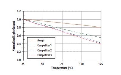 LED的亮度與溫度成負(fù)系數(shù)。為了能夠處理超過(guò)+105°C(汽車(chē)1級(jí)和2級(jí))的環(huán)境溫度,低溫漂移在 地減少參數(shù)溫度漂移方面具有顯著優(yōu)勢(shì)。用于Avago汽車(chē)級(jí)光電耦合器的LED在+125°C時(shí)通常下降<20%,而商用(消費(fèi)級(jí)和通用工業(yè))紅外LED通常在+125°C時(shí)下降高達(dá)60%(圖3) )。由于這超出了商用LED的建議溫度范圍,因此確實(shí)突出了重要的一點(diǎn),即只有特殊設(shè)計(jì)的用于高溫工作的LED才能用于汽車(chē)級(jí)光耦合器。