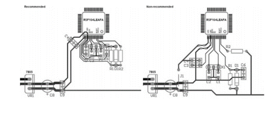 旁路電容器。推薦板上的旁路電容器C4比非推薦板上的電容器更靠近MCU。并且從旁路電容器到MCU的布線比不推薦的布線短。特別是在非推薦板上,C4的引線沒(méi)有直接連接到VDD和VSS干線。 |