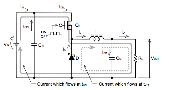 圖1是降壓轉(zhuǎn)換器的基本電路。當(dāng)開關(guān)元件Q1導(dǎo)通時(shí),電流從Vin流過線圈L并對(duì)輸出平滑電容器Co充電,輸出電流Io被提供給Vin。此時(shí)流入線圈L的電流產(chǎn)生磁場,電能轉(zhuǎn)化為磁能并蓄積儲(chǔ)存。當(dāng)開關(guān)元件 Q1 關(guān)斷時(shí),續(xù)流二極管 D 導(dǎo)通,L 中存儲(chǔ)的能量然后釋放到輸出側(cè)。