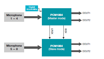 在采用多麥克風(fēng)設(shè)計(jì)和語(yǔ)音識(shí)別時(shí),我們也無(wú)需重新設(shè)計(jì);赑CM1864 的TI 圓形麥克風(fēng)板(CMB) 參考設(shè)計(jì)(如圖 3 所示)使用兩個(gè) 4 通道音頻ADC 與一組模擬麥克風(fēng)(  多含八個(gè))連接,并且可以在嘈雜的環(huán)境中提取清晰的用戶語(yǔ)音指令。