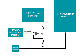 為了提高效率,您也可以根據(jù)內(nèi)容動(dòng)態(tài)調(diào)整放大器的輸出電源電壓。這種技術(shù)稱為包絡(luò)跟蹤。它僅在音樂(lè) 需要提高功率時(shí)跟蹤音頻內(nèi)容并提高電壓(輸出功 率),特別是在重低音部分(信號(hào)內(nèi)容中有許多峰值)。
