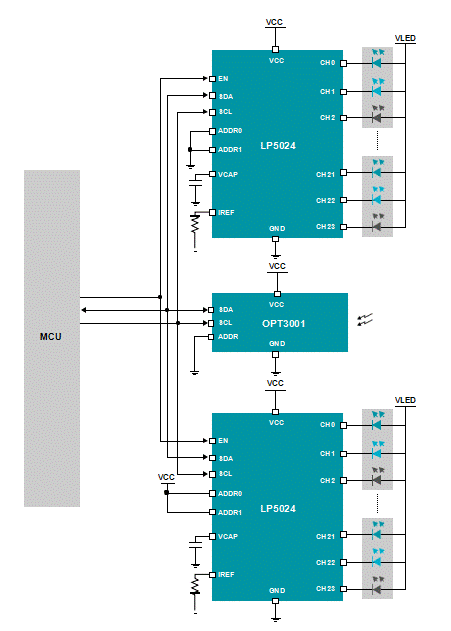 如圖 6 所示,各種LED 環(huán)形燈照明圖案參考設(shè)計(jì)說(shuō)明了如何使用裝有集成式LED 引擎的新型多通道RGB LED 驅(qū)動(dòng)器設(shè)計(jì)多色RGB LED 環(huán)形燈圖形子系統(tǒng)。使用環(huán)境光傳感器 IC 可自動(dòng)控制LED 亮度。