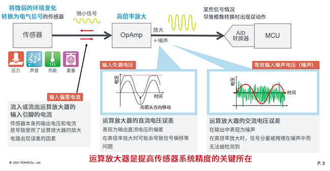 在電路中,傳感器是將微弱的環(huán)境變化轉(zhuǎn)換為電器特性的產(chǎn)品,在收到信號后會通過運(yùn)算放大器和比較器進(jìn)行轉(zhuǎn)換,期間要求運(yùn)算放大器或者比較器精度高或者具備低誤差的特性,這樣放大或者比較出來的信號才是可靠的。通過優(yōu)化輸入偏置電流、輸入失調(diào)電壓,以及等效輸入噪聲電壓這些運(yùn)算放大器自身的參數(shù),可以使傳感器系統(tǒng)的精度得到提高。可以說,運(yùn)算放大器是提高傳感器系統(tǒng)精度的關(guān)鍵所在。