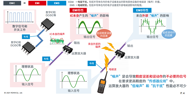 EMC(電磁兼容性)是評估噪聲的指標(biāo),通過EMI和EMS兩方面就可以評估出芯片本身能夠承受多少來自外部的噪聲干擾。對此,ROHM開發(fā)出了低噪聲的運(yùn)算放大器以及抗EMS性能非常出色的運(yùn)算放大器。
