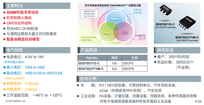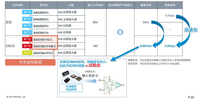 目前車載用EMARMOUR™運(yùn)算放大器和比較器系列產(chǎn)品陣容,包括2018年推出的四款EMARMOURTM系列雙極型產(chǎn)品,以及此次發(fā)布會推出的新產(chǎn)品BD87581YG-C以及BD87582YFVM-C,新產(chǎn)品是CMOS類型的運(yùn)算放大器,其偏置電流、轉(zhuǎn)換速率都比上一代的雙極型產(chǎn)品有較大提高。