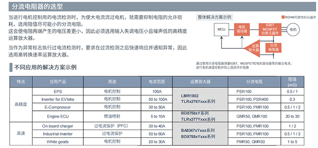 在設(shè)計(jì)過程中,如何選擇合適的運(yùn)算放大器和分流電阻器呢?ROHM可以提供不同的解決方案,通過使用分流電阻器來測量IGBT、MOSFET和電機(jī)驅(qū)動器等的輸出電流,進(jìn)行電機(jī)速度控制并防止其損壞的電路?蛻艨梢愿鶕(jù)不同的應(yīng)用場景來選擇,比如高精度控制和高速響應(yīng),ROHM都有相應(yīng)的解決方案。