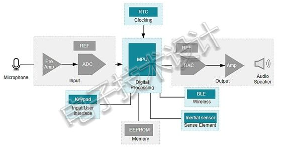 針對聽戴式裝置設計,類比電路透過麥克風轉換聲音,進行放大和調節(jié)后,再將其發(fā)送到微控制器(MCU),讓MCU進一步調節(jié)并過濾訊號,最后驅動微型揚聲器,將訊號傳送至耳膜。基于微處理單元(MPU)的數(shù)位處理可以促進背景雜音和聲學反饋消除,增強語音效果,并提供自動增益控制(AGC)。