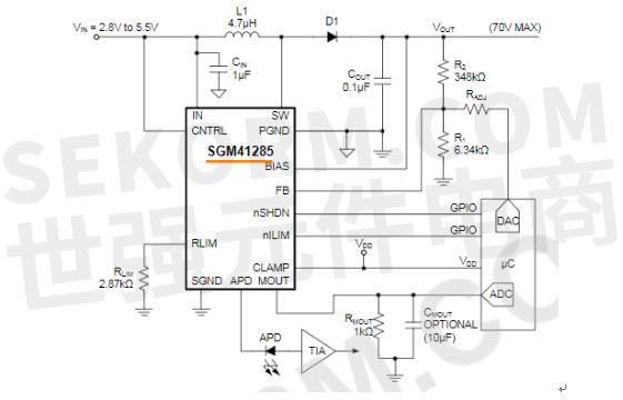 圣邦微的SGM41285作為一款DCDC升壓芯片,輸入電壓(VIN)為2.8V~5.5V,具有寬范圍的輸出電壓(VIN+5V)~70V,輸出功率最高300Mw,高壓側(cè)配備了高速可調(diào)限流的電流監(jiān)測器,提供500nA~4mA的高精度電流監(jiān)測,適用于光模塊APD的偏置和監(jiān)測應(yīng)用。SGM41285典型應(yīng)用電路如圖1所示。