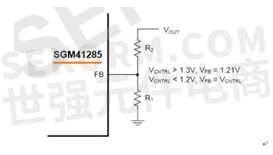 2、輸出電壓設(shè)置。SGM41285輸出電壓通過FB引腳與GND之間分壓電阻進(jìn)行設(shè)置,如圖2所示。R1(R1與GND之間)一般選擇 5 kΩ和10 kΩ之間,然后利用下式計算R2(Vout與FB之間):