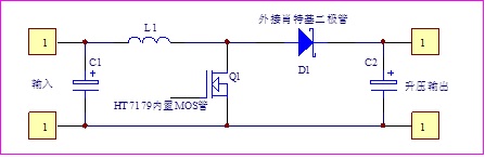 HT7179內(nèi)部集成15A的MOS開關(guān)管,外圍除了必須的電感之外,關(guān)鍵器件就是肖特基二極管。原理上是一種常見的開關(guān)直流boost升壓DC-DC電路,它通過開關(guān)管導通和關(guān)斷來控制電感儲存和釋放能量,從而使輸出電壓比輸入電壓高。基本的工作原理如下: