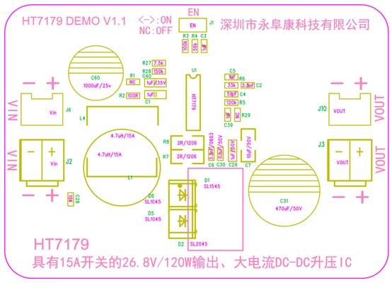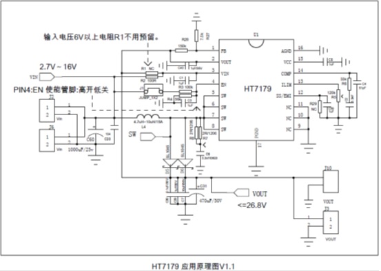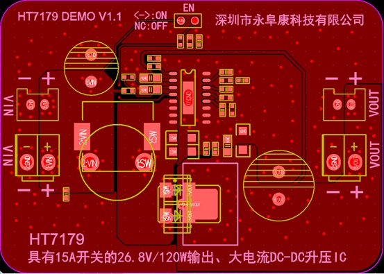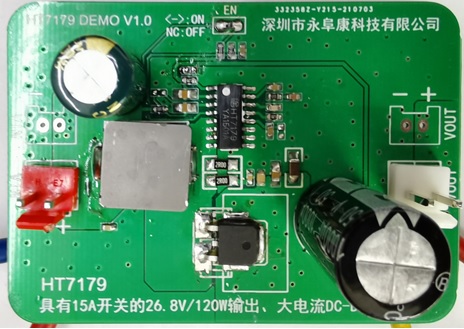 HT7179輸入電壓最低到2.7V,升壓輸出最高到26.8V。開關(guān)頻率固定350kHz,峰值電流可通過外圍電阻編程最大15A。支持低EMI工作模式,方便靈活。采用eSOP-16封裝,加上完善的輸出過壓,過熱保護,指標以及可靠性非常出色。HT7179是替代26V/100W左右