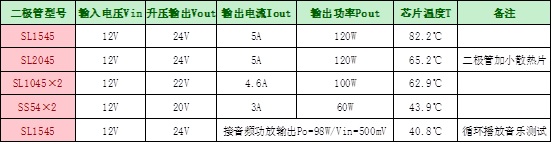 (5). HT7179接不同型號二極管對應升壓輸出電壓、電流、功率以及芯片表面溫度測試: