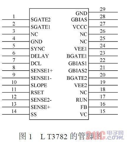 LT3782是美國(guó)凌力爾特公司生產(chǎn)的兩相步進(jìn)升壓型DC/DC控制器,28引腳SSOP封裝芯片,開關(guān)頻率在150~500kHz之間可編程,由于采用兩相BOOST拓?fù)浣Y(jié)構(gòu)。對(duì)輸出場(chǎng)效應(yīng)管漏電流和肖特基二極管通過(guò)電流的要求都減少一半,即兩個(gè)輸出相位差180°,兩個(gè)輸出間互相抑制輸出紋波電流,輸出紋波是單相BOOST轉(zhuǎn)換電路的1/3。電源效率高,對(duì)散熱的要求小。圖1是LT3782的管腳圖,第29引腳是芯片底部的散熱腳。27引腳連接輸入電源;4引腳接地;11引腳用來(lái)設(shè)定開關(guān)頻率;20和23BGATE引腳用來(lái)驅(qū)動(dòng)場(chǎng)效應(yīng)管的柵極;8,9,12和13SENSE引腳用來(lái)反饋場(chǎng)效應(yīng)管的輸出電流;16引腳是輸出電壓反饋引腳,該腳電壓為2.44V,通過(guò)反饋電阻可以設(shè)定輸出電壓值。17引腳是低電壓關(guān)斷引腳,當(dāng)該引腳的電壓大于2.45V時(shí),器件才開始工作,當(dāng)該引腳的電壓小于0.3V時(shí),器件進(jìn)入低電壓關(guān)斷模式。14引腳是軟啟動(dòng)引腳,當(dāng)加電時(shí),輸出電壓從0V漸變到設(shè)定的輸出電壓值,典型的啟動(dòng)時(shí)間可以由下式計(jì)算:
