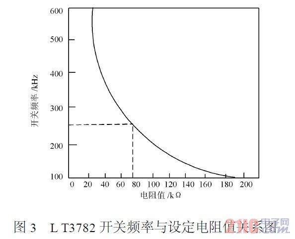 圖2中,電阻R1用來(lái)設(shè)定LT3782的開關(guān)頻率,LT3782的開關(guān)頻率在150~500kHz之間可編程。這里選取開關(guān)頻率為250kHz,參照?qǐng)D3取電阻值R1=75kHz。