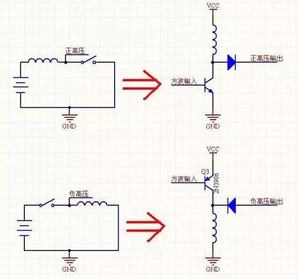 你可以清楚看到演變,電路中把開關(guān)換成了三極管,用固定頻率的方波控制三極管的開關(guān)就能實(shí)現(xiàn)升壓。不要小看這兩個(gè)圖,事實(shí)上,所有開關(guān)電源都是由這兩個(gè)圖組合變換而來的。