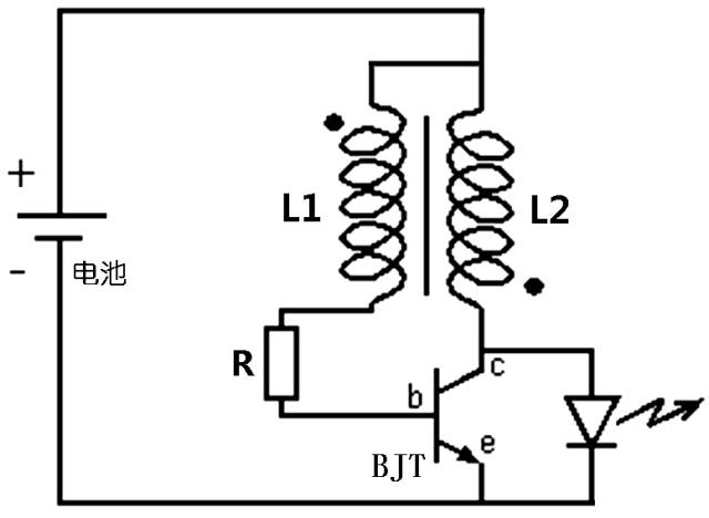 標(biāo)準(zhǔn)焦耳神偷電路 通常1.5V的干電池用完之后還會(huì)有1.1V左右的電壓,說明此時(shí)電池內(nèi)還有能量,只不過內(nèi)阻已經(jīng)變的很大,輸出電流很微弱,已經(jīng)無法驅(qū)動(dòng)一般的電路,更無法點(diǎn)亮LED。而焦耳神偷電路可以通過磁感線圈產(chǎn)生高頻脈沖電壓,使LED導(dǎo)通,通過調(diào)整合適的參數(shù),可以將電池電壓升高10-100倍以上。 焦耳神偷原理 1. 電流經(jīng)L1流入BJT的基極,使BJT開始導(dǎo)通,集電極產(chǎn)生電流,集電極端的線圈L2產(chǎn)生變化磁通量,使基極線圈L1感應(yīng)出電動(dòng)勢(shì),并正向加在BJT的基極上。 2. 基極電流由于加了電動(dòng)勢(shì)而增大,使BJT集電極電流進(jìn)一步增加,這個(gè)正反饋將持續(xù),直到BJT飽和,基極電流的變化無法再引起集電極電流的變化。