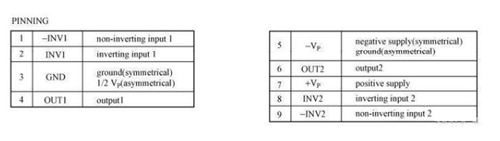 在使用TDA1521 進(jìn)行設(shè)計之前,同樣需要知道其引腳功能,但首先我們要知道引腳的順序。通常來說,一個單列直插的集成電路如果正面面向使用者時,其左邊的引腳為1 腳,向右依次遞增。此外,芯片制造商通常也會在1 腳所在的方向做標(biāo)記,以便使用者辨別,圖中,在TDA1521 的左側(cè)有一條白條,意味著芯片的第1引腳應(yīng)該在左側(cè)。