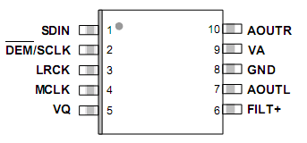 HT5010 HT5014/5/8系列產(chǎn)品是一款低成本的立體聲DA轉(zhuǎn)換 器,內(nèi)部集成了內(nèi)插濾波器、DA轉(zhuǎn)換器和輸出模擬 濾波等電路。其可支持多種音頻數(shù)字輸入格式,最大 支持24-bit字節(jié)。 CS4344/ES7144/MS4344 MSOP-10 3.3V 24-Bit, 192kHz立體聲D/A數(shù)模轉(zhuǎn)換器