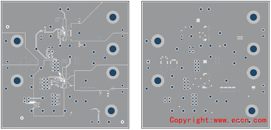 圖11.評(píng)估模塊TPS543620EVM PCB設(shè)計(jì)圖:左:中2層布局;右:底層布局