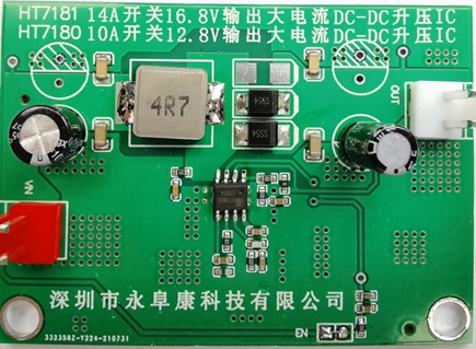 深圳市永阜康科技有限公司針對升壓值13V以下的DC-DC升壓應用需求,推廣一款集成10A開關管的12.8V輸出、大電流非同步DC-DC升壓IC:HT7180。HT7180采用獨到的電路研發(fā)技術以及先進的半導體工藝制程,基于SOP8封裝,工作效率高達90%以上,無需外加散熱器,3.7V輸入升壓到12V,可穩(wěn)定輸出2A電流。