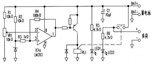 這個電路的結構比較簡單,使用一個片常用的電壓比較器芯片-LM393。這是一個雙電壓比較器芯片,在這個電路中使用了其中的一片。這個電路的工作原理是:蓄電池除了給負載部分供電外,還會給這個電路提供電源。電壓比較器的同相輸入端由電阻R2通過穩(wěn)壓二極管穩(wěn)壓,經(jīng)過電阻R3提供基準電壓,同時蓄電池電壓會經(jīng)過電阻R1以及可變電阻VR1的分壓輸入到電壓比較器的反相輸入端,這一路作為電池電壓的檢測,通過調(diào)節(jié)VR1使電壓在放電保護電壓。正常工作時,反相輸入端的電壓會高于同相輸入端,比較器的輸出端會輸出低電平,驅動外接的PNP三極管導通,繼電器線圈得電工作,常開觸點閉合,蓄電池會給負載供電。