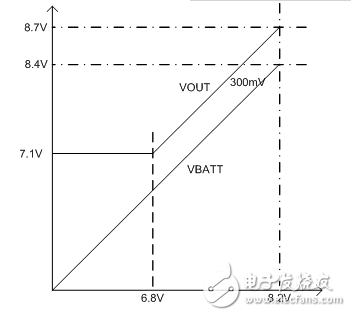 2)如果VBATT<6.8V,VOUT則會(huì)固定在7.1V,為電池提供充電驅(qū)動(dòng)能力。