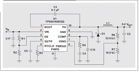 為了說明使用高開關(guān)頻率的權(quán)衡過程,我們設(shè)計了三個獨立電源,其工作頻率分別為100、300和750 kHz。所有這三種設(shè)計,輸入電壓均為48V,輸出電壓均為5V,而輸出電流均為1A。這些要求常用于為一個5-V邏輯USB,或者為其它DC/DC轉(zhuǎn)換器使用的中頻通用5-V總線供電,例如:低壓降穩(wěn)壓器等。若想建立一些設(shè)計限制,所選允許紋波電壓需為50mV,其約為輸出電壓的1%;同時選擇使用0.5 A的峰至峰電感電流。德州儀器TPS54160是一種集成MOSFET的2.5-MHz、60-V、1.5-A降壓DC/DC轉(zhuǎn)換器,用作所有設(shè)計的穩(wěn)壓器。TPS54160特有外部補償和快速可編程頻率,適用于一些高輸入電壓的工業(yè)應(yīng)用。