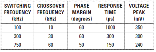 瞬態(tài)響應(yīng)是電源性能級別的一個較好指標(biāo)。我們利用每種電源的波特圖來表明高開關(guān)頻率的對比情況(參見圖3)。如圖所示,每個電源的相位裕度在45°和55°之間,其表明瞬態(tài)響應(yīng)得到較好的抑制。交叉頻率約為開關(guān)頻率的1/8。使用快速開關(guān)DC/DC轉(zhuǎn)換器時,設(shè)計人員應(yīng)確保電源IC誤差放大器具有足夠的帶寬來支持高交叉頻率。TPS54160誤差放大器的單位增益頻寬一般為2.7 MHz。表5顯示了實際瞬態(tài)響應(yīng)時間以及電壓峰值過沖的相關(guān)值。開關(guān)頻率越高,過沖值便越是更低,原因是更寬的帶寬。