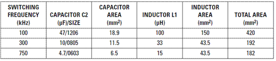 表4列出了三種設(shè)計要求的總電路板面積,以及電容和電感的焊盤面積。電容或者電感的建議焊盤面積,稍稍大于單個組件本身,且三種設(shè)計舉例均使用了該面積。每個組件占用的面積相加(其包括IC、濾波器以及所有其它小型電阻器和電容的焊盤尺寸),然后將得到的結(jié)果乘以2倍(考慮到組件的間距),便得到總面積。100-kHz和750-kHz設(shè)計之間存在近250 mm2的總面積節(jié)省,從而使濾波器體積縮小50%,而板空間占用減少55%。但是,存在收益遞減規(guī)律,因為電容和電感值無法減少至零!換句話說,不斷推高頻率并不能夠一直減小總尺寸,因為你無法總是能夠在市場上買到這些尺寸適合且批量生產(chǎn)的電感和電容。注意,33-µH和15-µH電感占用相同的面積。存在這種可能性,是因為33-µH電感的高度為3.5 mm,而15-µH電感僅高2.4 mm。我們想通過這兩種電感來說明的觀點是:電感與體積成正比例關(guān)系。