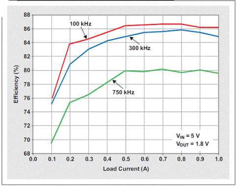三個例子的重要損耗組成部分,來自于FET驅(qū)動損耗、FET開關(guān)損耗和電感損耗。FET電阻和IC損耗是一致的,因為所有三個設(shè)計中都使用了相同的IC。由于所有例子中都選擇了低ESR的陶瓷電容,因此電容損耗可以忽略不計。為了表明高頻開關(guān)的影響,我們對每個例子的效率都進行了測量,并將其顯示在圖2中。該圖清楚地表明,效率隨開關(guān)頻率增加而下降。若想提高所有頻率下的效率,需要尋找到一種全負載狀態(tài)下低漏到源“導(dǎo)通”電阻、低門電荷或者低靜態(tài)電流規(guī)范的DC/DC轉(zhuǎn)換器;或者尋找到一些具有更低等效電阻的電容和電感。