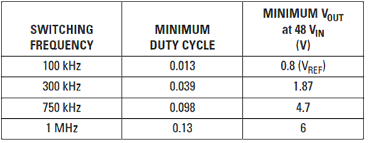 最小可控“導(dǎo)通”時間限制是DC/DC轉(zhuǎn)換器IC的一個特點,其為脈寬調(diào)制(PWM)電路的最窄可達脈寬。在降壓轉(zhuǎn)換器中,開關(guān)周期期間功率MOSFET導(dǎo)通的時間百分比被稱作占空比,其等于輸出電壓與輸入電壓的比。使用TPS54160轉(zhuǎn)換器時,占空比為0.104(4 V/48 V),而數(shù)據(jù)表中列出的最小“導(dǎo)通”時間為130 ns?煽孛}寬限制產(chǎn)生一個最小可達占空比,而用最小“導(dǎo)通”時間乘以開關(guān)頻率,我們可以輕松地計算出該占空比的大小。一旦知道了最小占空比,利用VIN乘以最小占空比,我們便可以計算出最低可達輸出電壓。最低輸出電壓同樣也受轉(zhuǎn)換器基準(zhǔn)電壓的限制,使用TPS54160時其為0.8V。