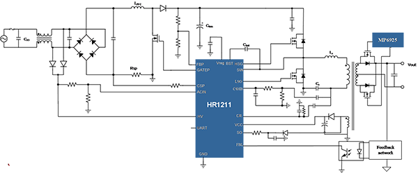 MPS AC/DC的另一款成名之作HR1211,也充分地體現(xiàn)了MPS的產(chǎn)品優(yōu)勢,這是一款集成多模式PFC和電流型LLC的二合一控制器。芯片集成了高壓電流源、安規(guī)認證的X電容放電電路、PFC和LLC的高壓驅(qū)動電路,從而實現(xiàn)了非常簡潔的外圍電路。