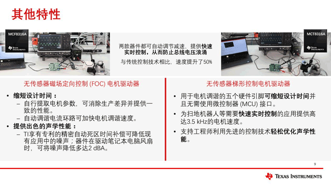 本次推出兩款新產(chǎn)品,分別是MCF8316A和MCT8316A。前者采用磁場定向控制技術(shù),后者梯形控制技術(shù),無需傳感器,通過這兩款產(chǎn)品,可以把整個電機(jī)方案的尺寸減少70%。