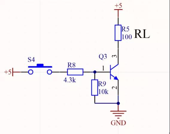 如下圖為PNP型三極管,按下開關(guān)S2,約1mA的Ib流過箭頭,三極管工作在飽和狀態(tài),e極到c極完全導(dǎo)通,c極電平接近5V,負(fù)載RL兩端壓降接近5V。