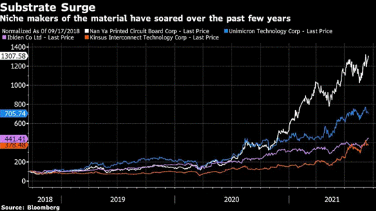 截至周三的過(guò)去三年中,在中國(guó)臺(tái)灣市場(chǎng)上市的南亞電路板已累計(jì)上漲了1219%,分析師預(yù)計(jì)其未來(lái)還將進(jìn)一步走高。其他ABF載板主要生產(chǎn)商欣興電子(Uniimicron Technology)、景碩科技(Kinsus Interconnect Technology)和Ibiden等也都出現(xiàn)了飆升。