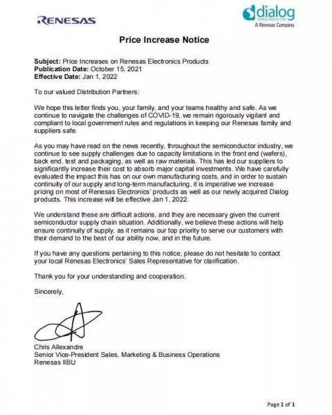 根據(jù)流傳的漲價(jià)函顯示,瑞薩此次漲價(jià)原因是前端代工、后端封測(cè)以及原材料產(chǎn)能限制,供應(yīng)商大幅提高成本,為保持供應(yīng)和制造的長(zhǎng)期連續(xù)性,必須提高大部分產(chǎn)品以及新收購(gòu)的 Dialog 產(chǎn)品定價(jià)。