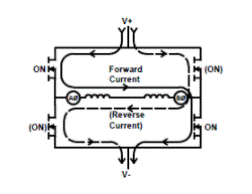 圖2一種H橋配置,顯示了完整的電路以及電流在每個(gè)方向上流過(guò)電機(jī)繞組的情況。