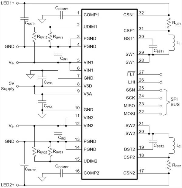 Texas Instruments公司的TPS92520-Q1是一款單片雙路同步降壓LED驅(qū)動器,具有4.5V至65V寬工作輸入電壓范圍,可獨立為兩串串聯(lián)的LED供電。該芯片具有自適應(yīng)導(dǎo)通時間平均電流模式控制功能,經(jīng)設(shè)計可與分流FET調(diào)光技術(shù)和基于LED矩陣管理器的動態(tài)光束前照燈兼容。