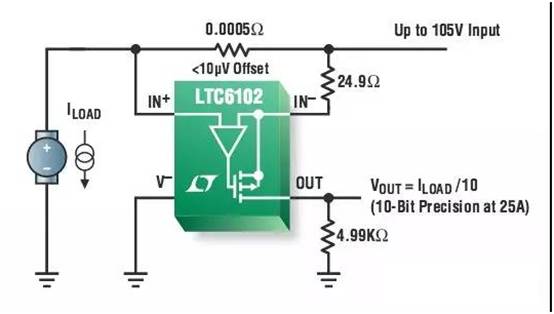 圖4:Linear的LTC6102使用一個MOSFET。