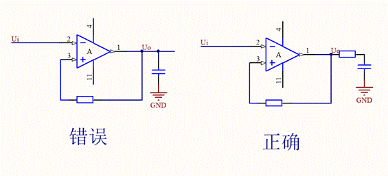 正確的去耦電容應(yīng)該要組成RC電路,就是在運(yùn)放的輸出端先串入一個(gè)電阻,然后再并接去耦電容。這樣做可以大大削減運(yùn)放輸出瞬間電流,也不會(huì)影響環(huán)路的相位特性,可以避免振蕩。
