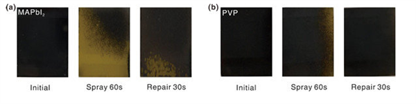 含有(a)和不含(b)聚乙烯吡咯烷酮的薄膜,顯示了水蒸氣噴涂60秒后,自修復30秒后的狀態(tài)變化