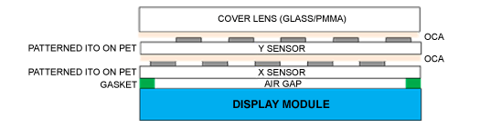 觸摸傳感器和保護(hù)蓋之間的氣隙:觸摸屏設(shè)備最終用戶(hù)報(bào)告的最常見(jiàn)問(wèn)題之一是保護(hù)蓋損壞。為了使產(chǎn)品更薄,可以將投射電容式觸摸傳感器層壓到防護(hù)鏡的背面。然而,當(dāng)更換破裂的保護(hù)蓋透鏡時(shí),還必須更換觸摸傳感器,這增加了維修成本。為了避免這種成本以及成本和較低的覆膜良率,設(shè)備制造商通常使用薄墊片將觸摸傳感器和保護(hù)蓋分開(kāi)。
