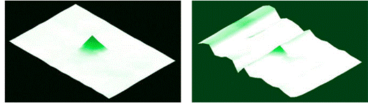 在4英寸顯示屏上的2mm導(dǎo)電筆的這些電容曲線(xiàn)中,左側(cè)的曲線(xiàn)反映了高SNR觸摸控制器的使用。右邊是一個(gè)低信噪比的觸摸控制器。測(cè)針位于綠色圓錐體的頂點(diǎn);白色表面的高度代表整個(gè)顯示器的背景噪音水平。SNR的大幅提高有效地降低了
