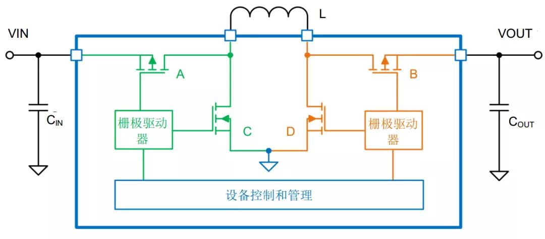 降壓-升壓轉(zhuǎn)換器將降壓轉(zhuǎn)換器(圖1中的綠色部分)與升壓轉(zhuǎn)換器(圖1中的橙色部分)合并在同一結(jié)構(gòu)中,從而可以有效地升高和降低輸出電壓。控制環(huán)路可以根據(jù)實際的輸入電壓和編程設(shè)定的輸出電壓來決定設(shè)備是否需要在降壓或升壓模式下運行。