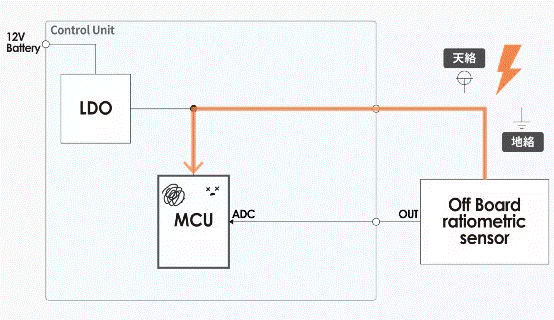 MCU(微控制器單元)和一個傳感器共享同一個 ECU 基板時,它們可輕易由一個電源提供電源電壓。
