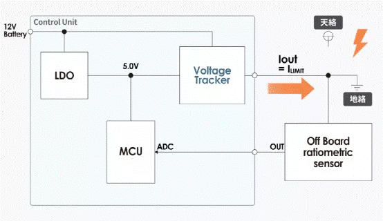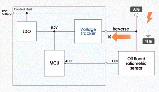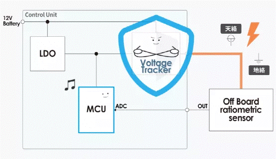電壓跟蹤器可將分離式傳感器的電源與 ECU 的電源分開,還配備了保護功能,以保護 MCU 免受由電源短路和接地短路故障導(dǎo)致的不必要損壞(參見圖